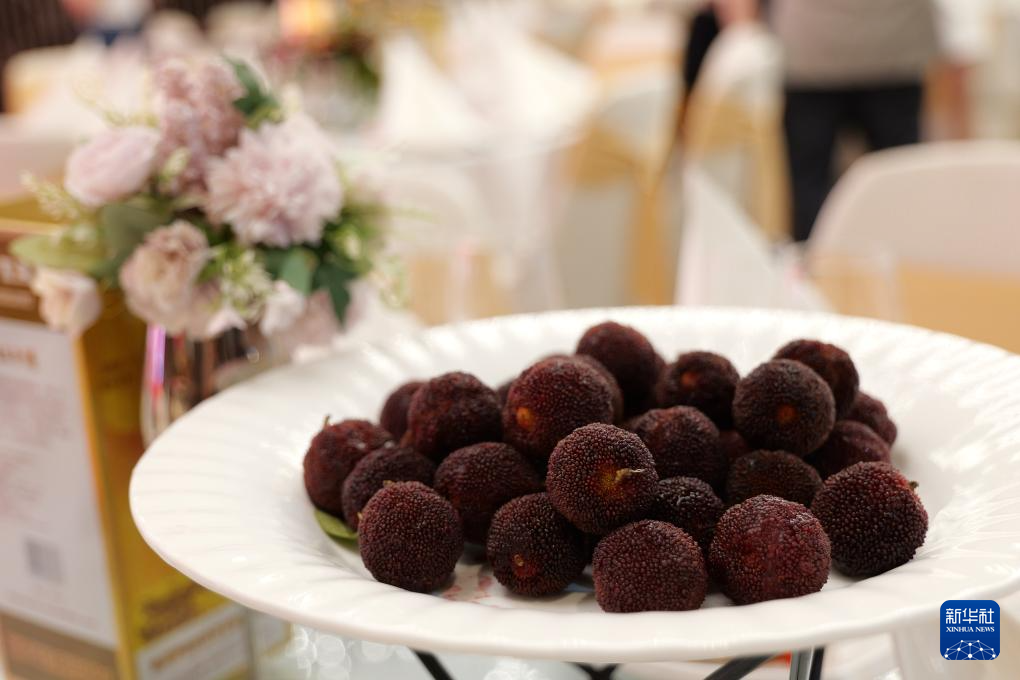 6月24日,在德国法兰克福一家餐厅,一名客人品尝新鲜的东魁杨梅。