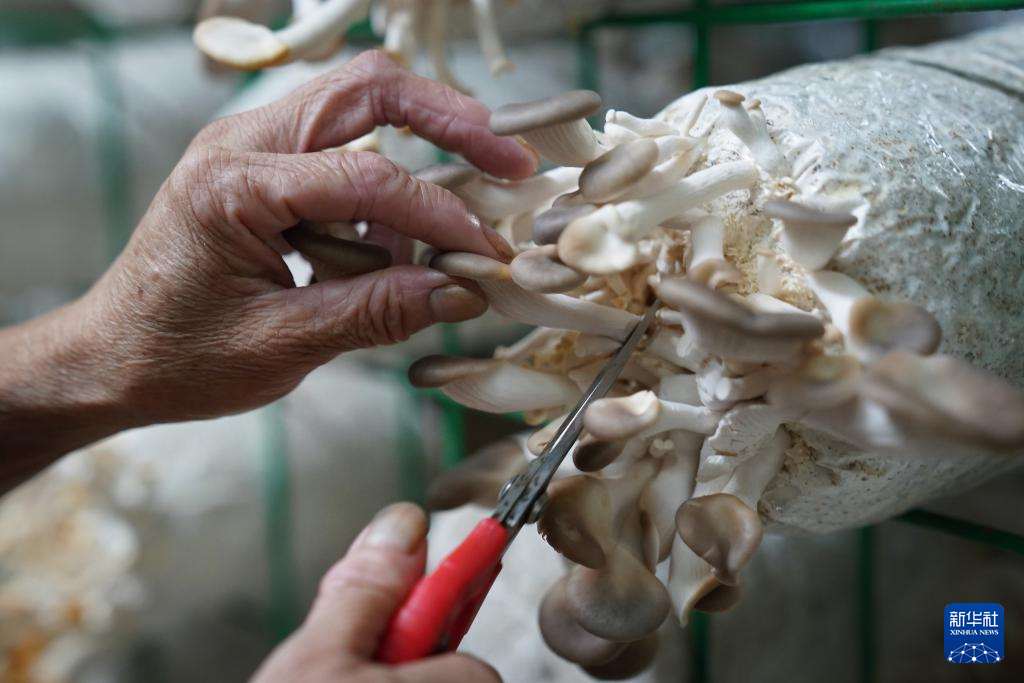 6月26日,在江西省南昌市红谷滩区流湖镇的一家食用菌生产基地,村民在采摘秀珍菇。