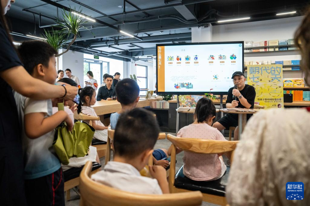 6月28日,在长沙图书馆湘江新区周家湾分馆,志愿者为小朋友进行书籍导读。
