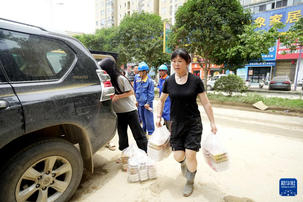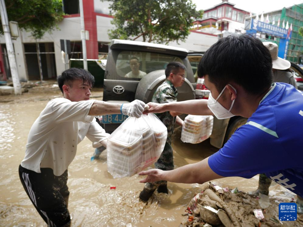 6月26日,在贵州省榕江县城,工作人员将盒饭送到抗洪救灾一线。