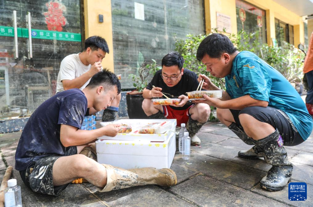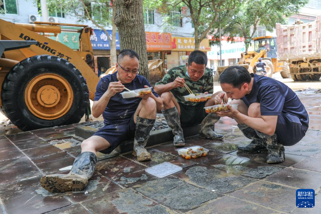 6月27日,在贵州省榕江县城,救援人员在救援间隙吃村民们送过来的盒饭。