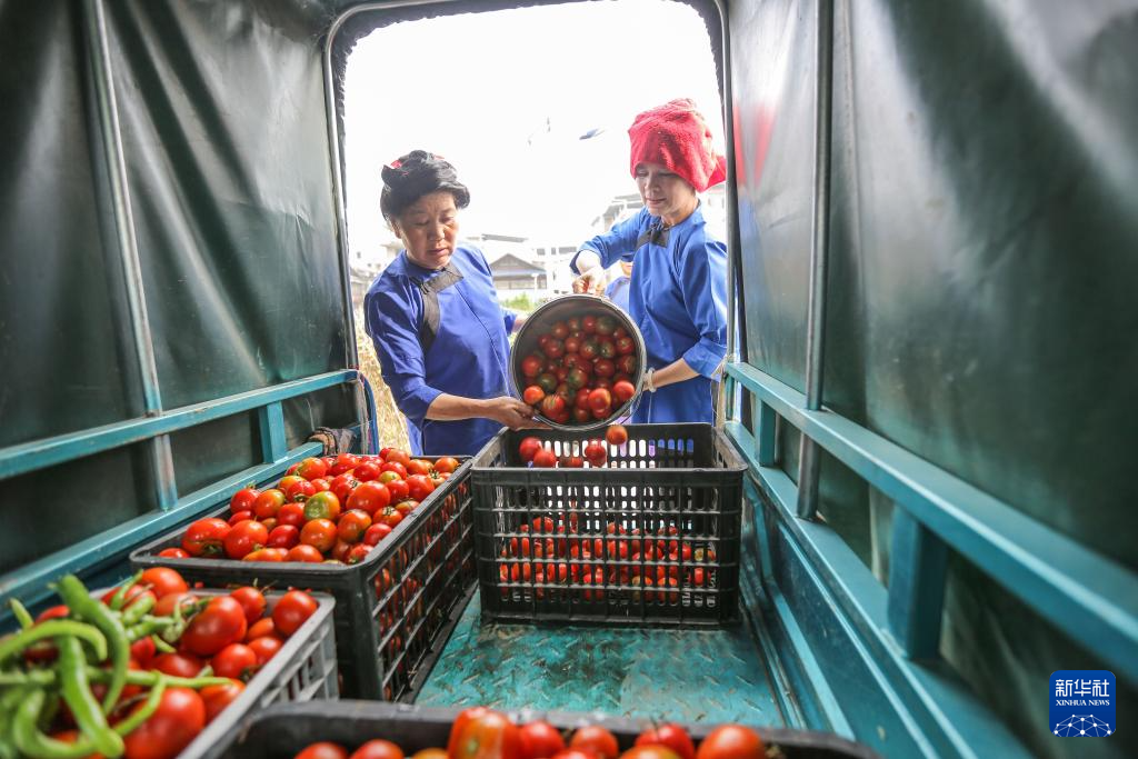 6月26日,贵州省榕江县古州镇月寨村村民从自家菜园采摘西红柿后装车,准备送到忠诚镇的后勤伙食保障点。