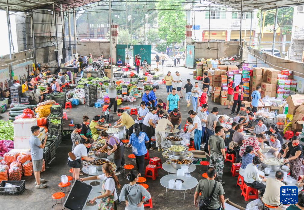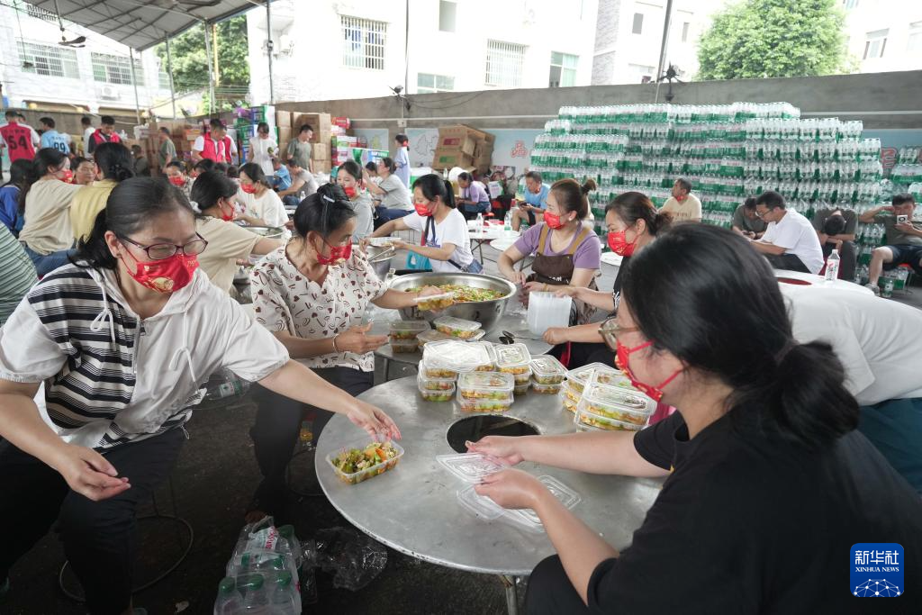 6月26日,村民在贵州省榕江县忠诚镇一处后勤伙食保障点打包盒饭。