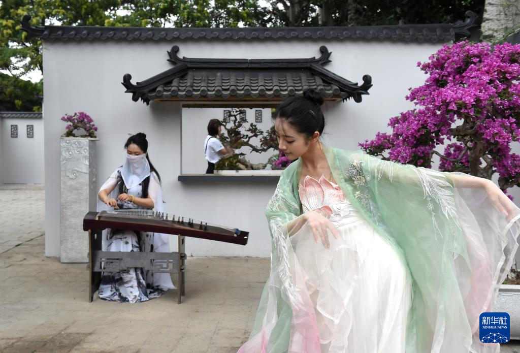 6月28日,表演者在圆明园“荷韵梅芳 御苑双姝”双花展现场演奏、舞蹈。