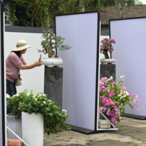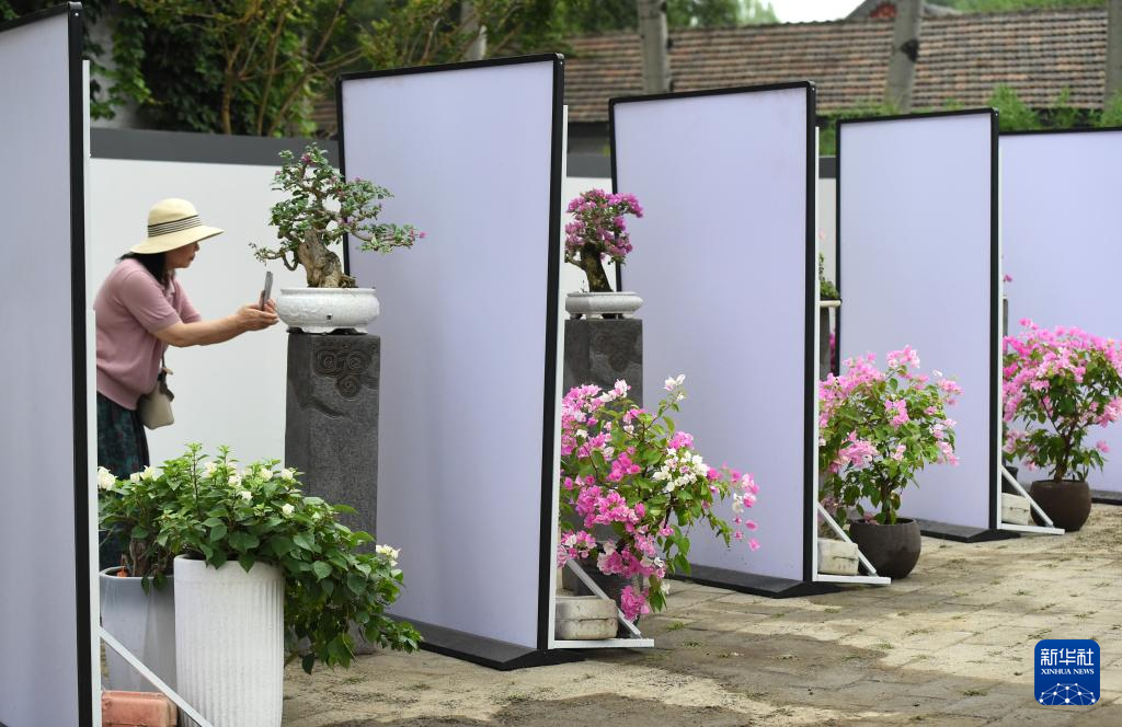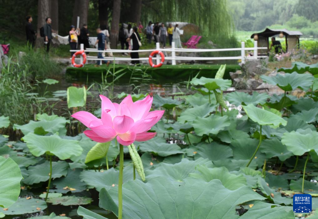 6月28日,游客在在圆明园“荷韵梅芳 御苑双姝”双花展上拍摄。