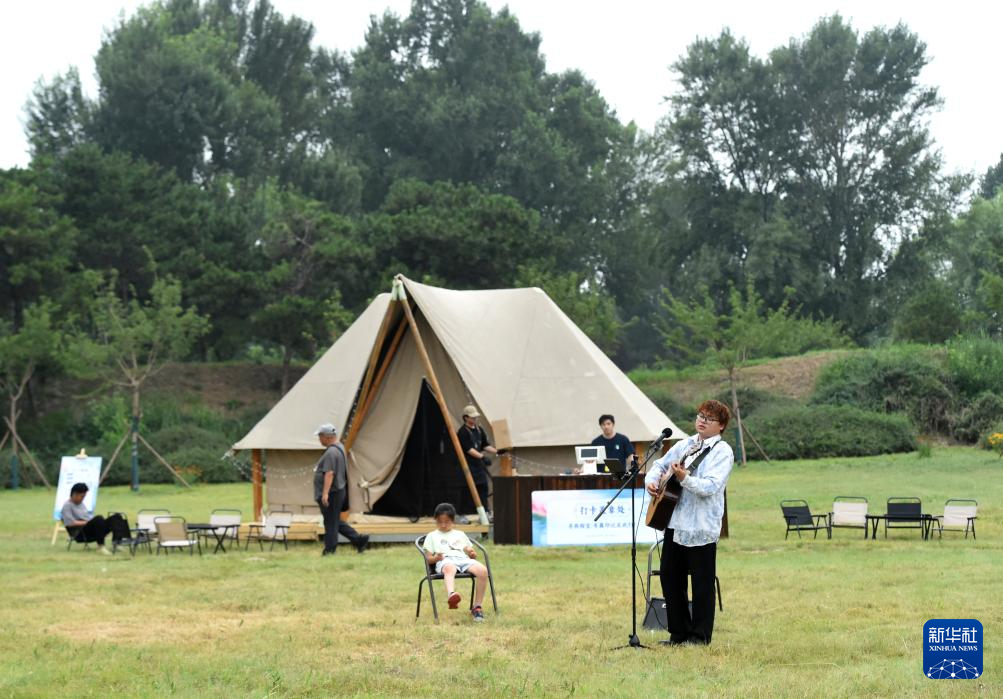 6月28日,一名歌手在圆明园“风荷朝露帐篷咖啡”处弹唱。
