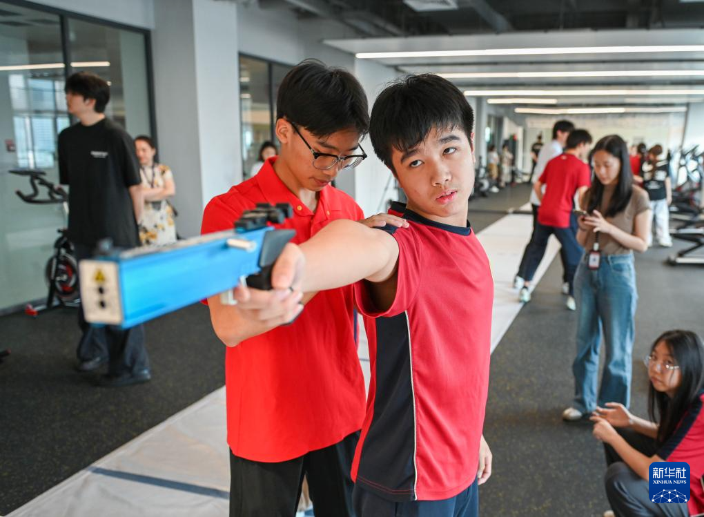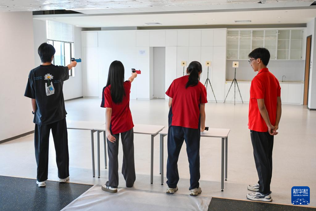 图为学生们在广州市中黄港澳子弟学校运动室进行射击训练(6月19日摄)。