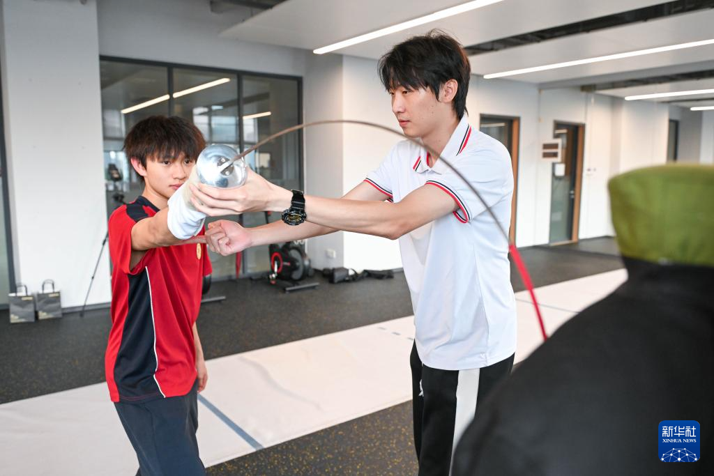 图为广东现代五项运动协会教练员肖勇炫(右)纠正广州市中黄港澳子弟学校港籍生张嗣涛击剑技术细节(6月19日摄)。
