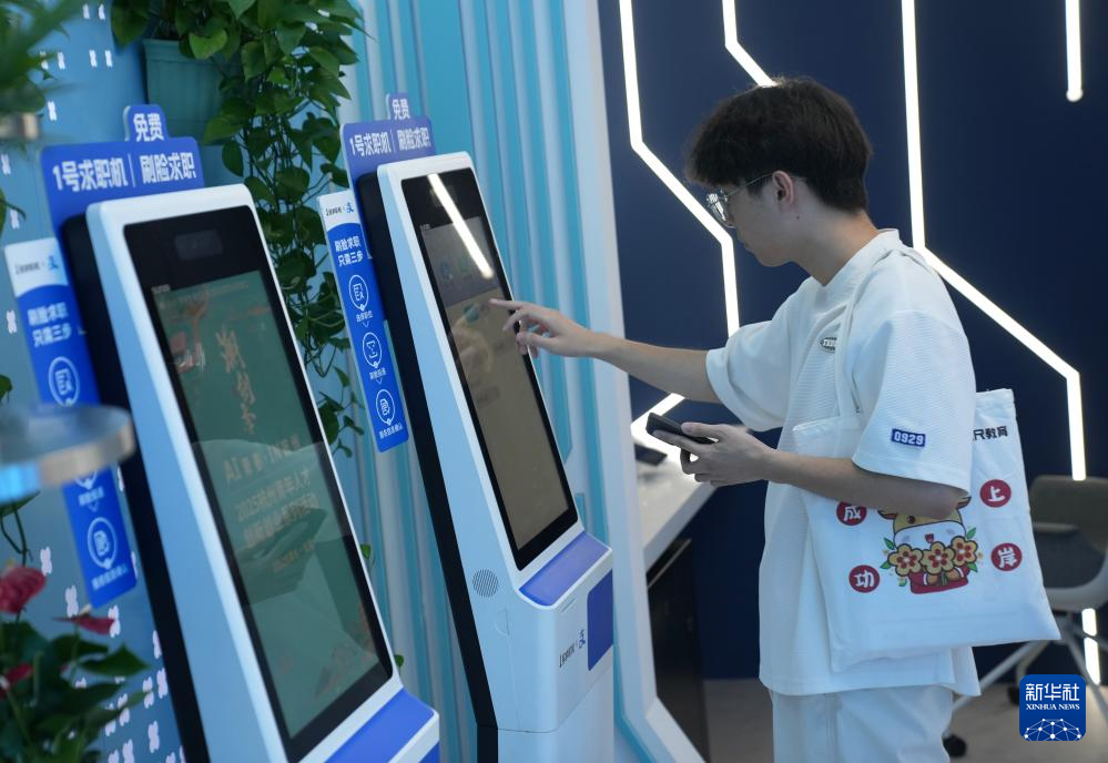 6月28日,求职者在招聘会现场的AI智能面试专区操作自助式智能求职机。