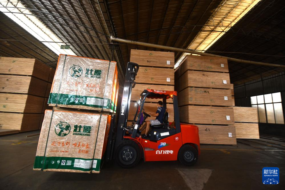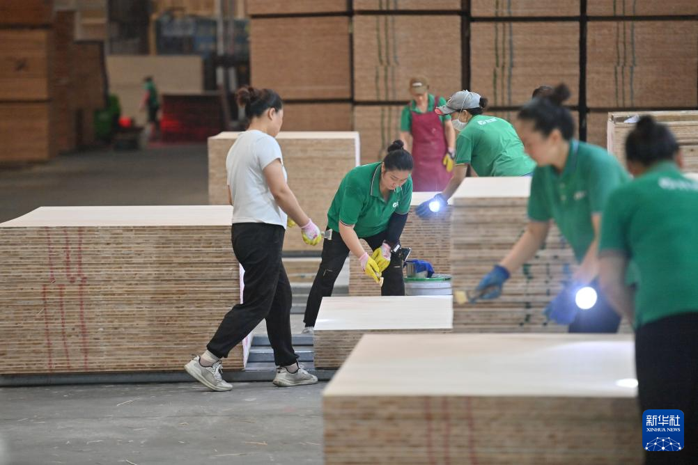 6月29日,工人在融安县一家香杉生态板生产企业的生产线上作业。