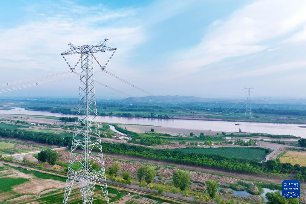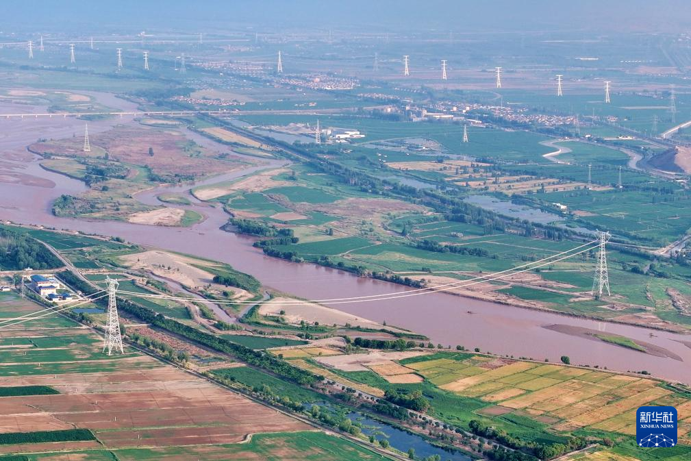 这是6月29日拍摄的“宁电入湘”工程宁夏中卫市境内跨黄河段线路(无人机照片)。