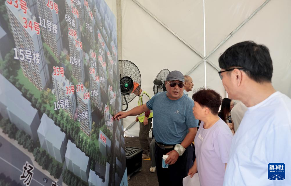 6月29日,居民在新房领钥匙现场查看新小区房屋分布图。