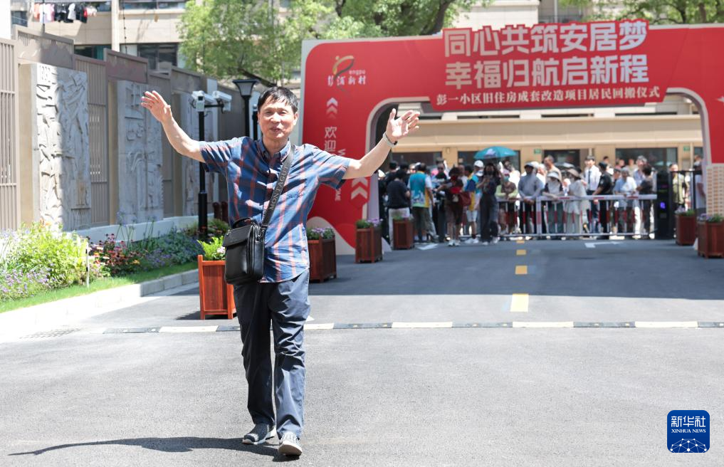 6月29日,一名前来领取新房钥匙的居民在步入小区时挥手致意。