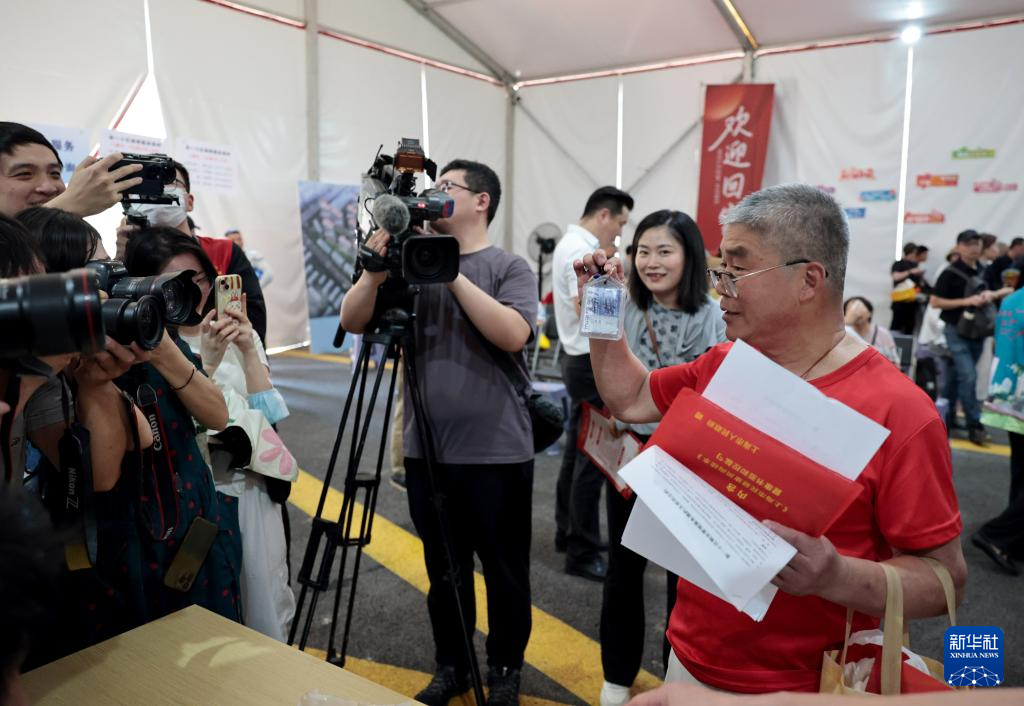 6月29日,居民施文跃向现场媒体展示他领取的新房钥匙。