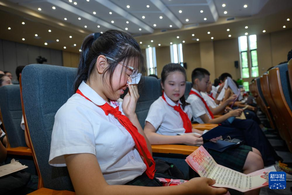 6月29日,小学毕业生在毕业庆典上阅读家长写的信时感动落泪。