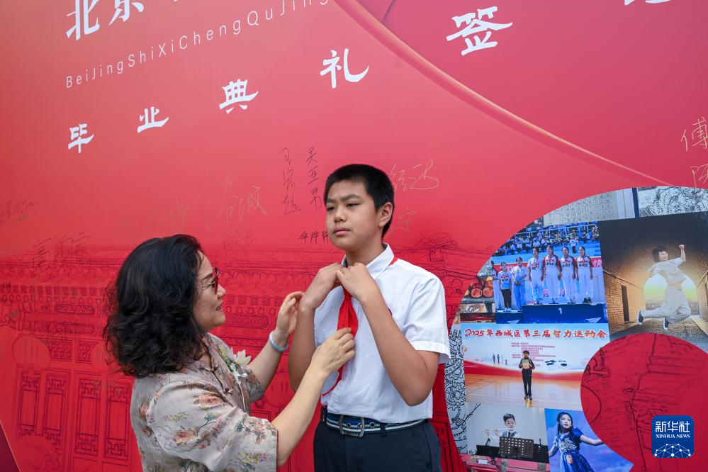 6月29日,京华实验学校校长李雪梅帮助小学毕业生整理红领巾。