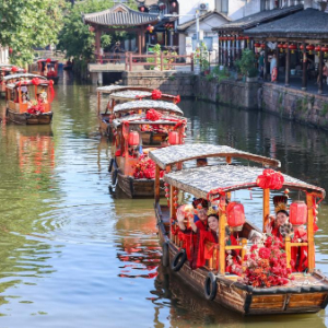 6月28日,新人乘坐婚船游览新市古镇。