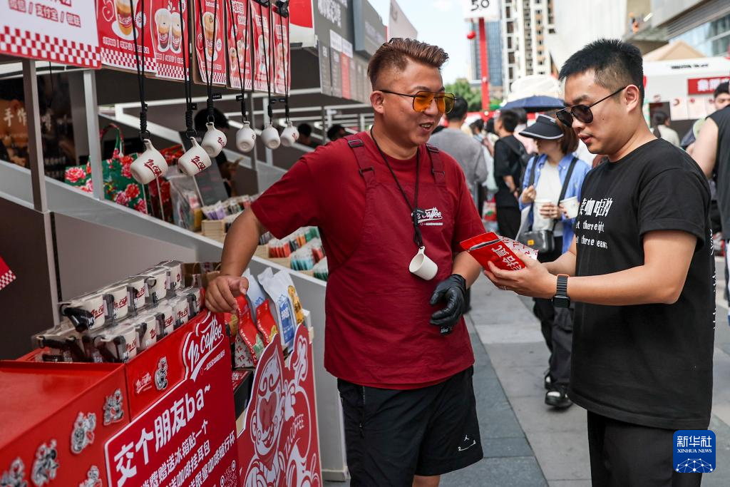 6月21日,在沈阳举行的咖啡市集上,刘佳迪(右)把顾客选购的咖啡豆装袋。