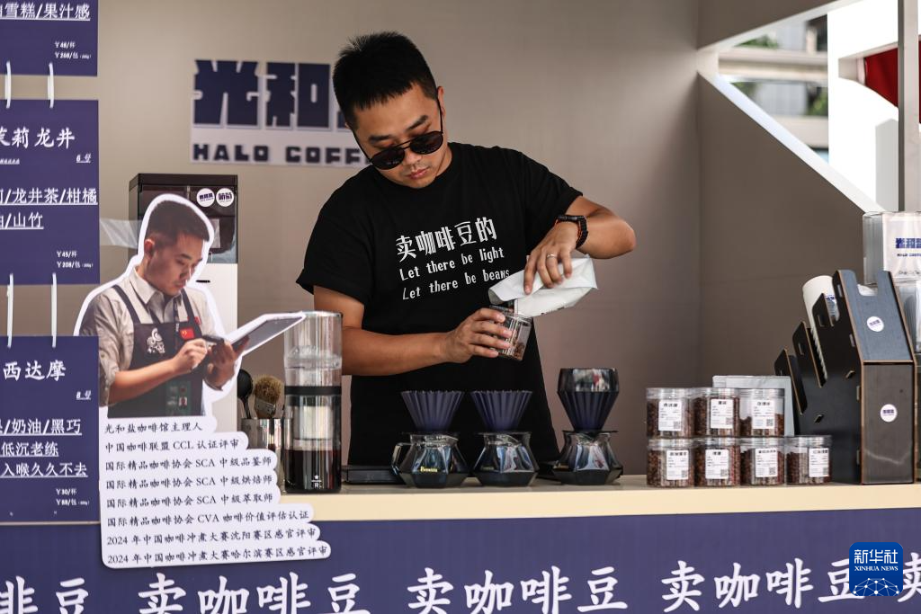 6月21日,在沈阳举行的咖啡市集上,刘佳迪整理售卖的咖啡豆。
