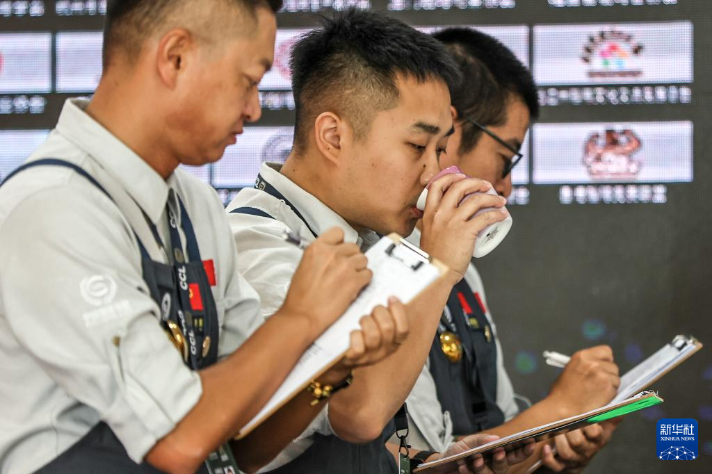 6月28日,刘佳迪(中)在大连举办的一场咖啡冲煮比赛中作为评委品尝参赛选手冲煮的咖啡。