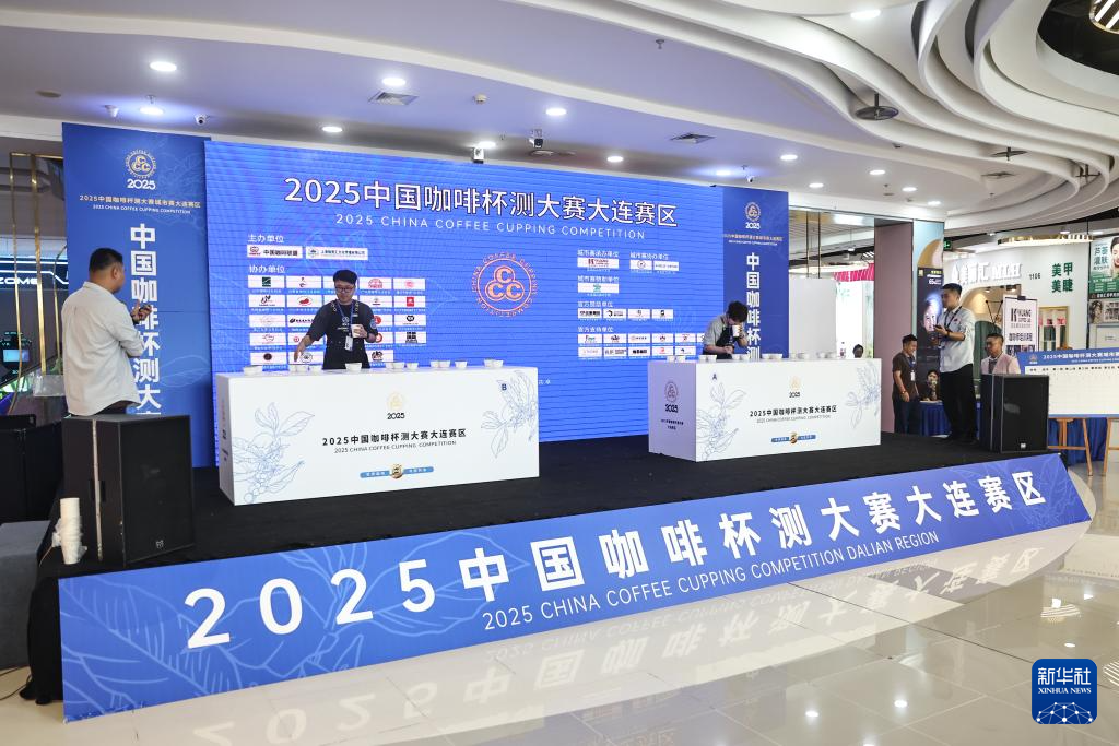 6月29日,刘佳迪(台上右一)在大连举办的一场咖啡杯测比赛中担任技术评审。