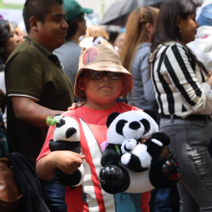 6月29日,在墨西哥首都墨西哥城查普特佩克动物园,游客拿着大熊猫玩偶参加“欣欣”的生日庆祝活动。