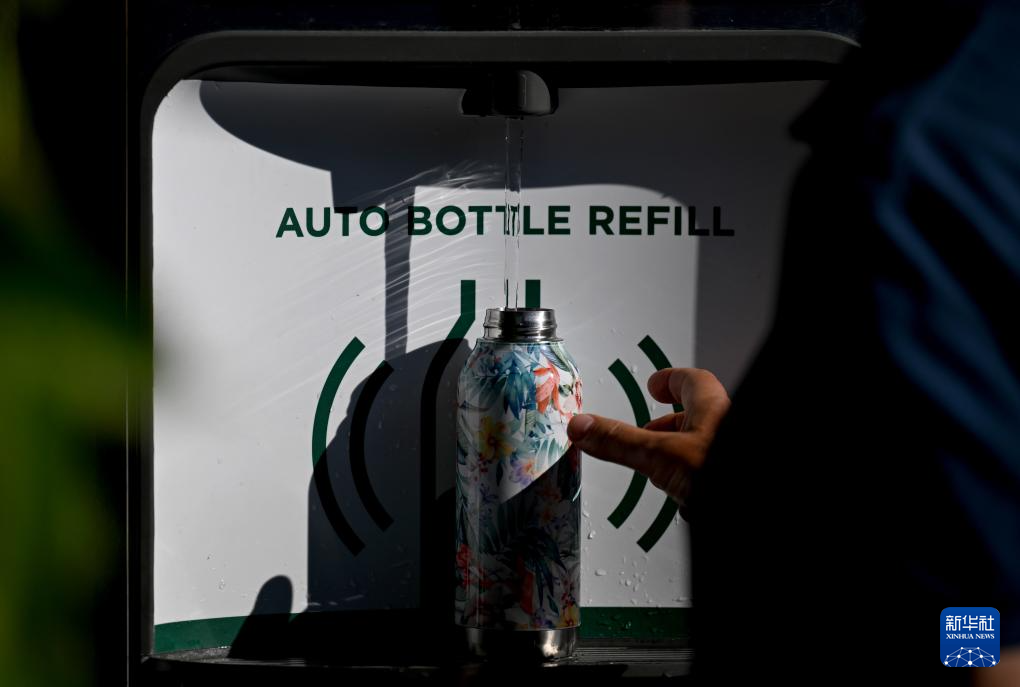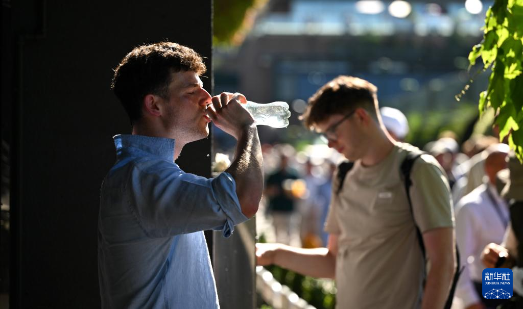 6月30日,一名观众在英国伦敦温布尔登网球公开赛赛场一处饮水机前取水。