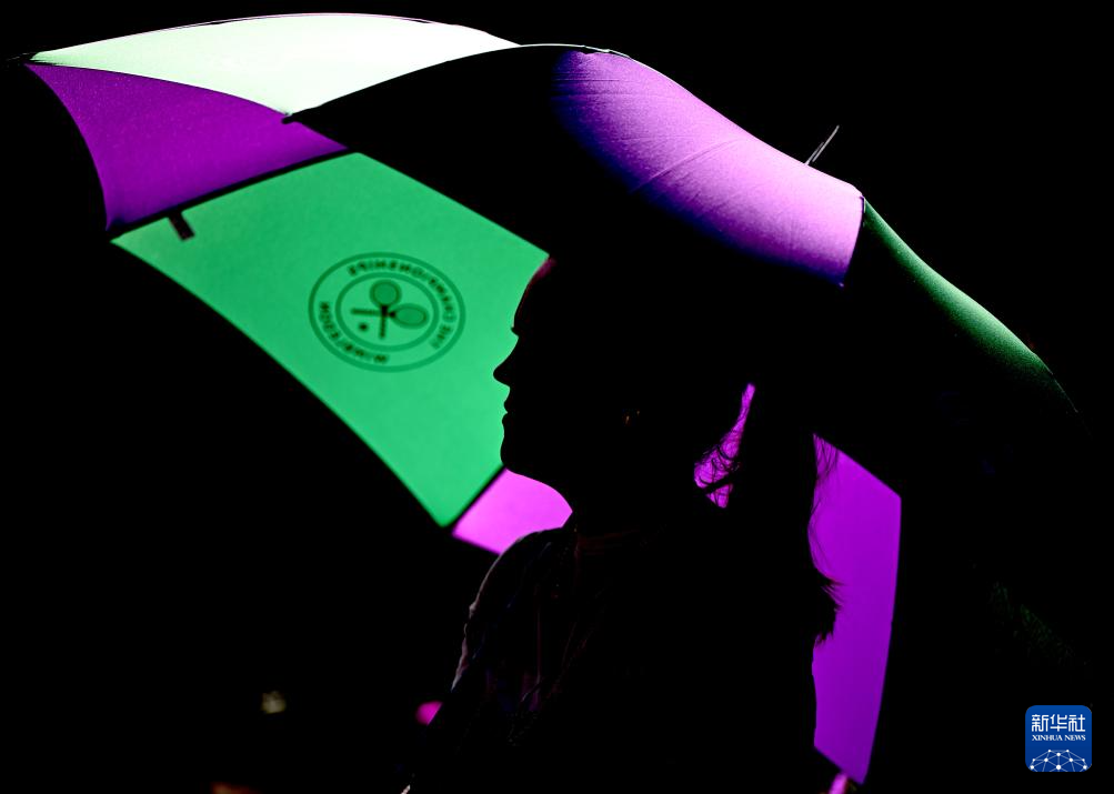 6月30日,在英国伦敦温布尔登网球公开赛赛场,一名女子撑伞遮挡阳光。