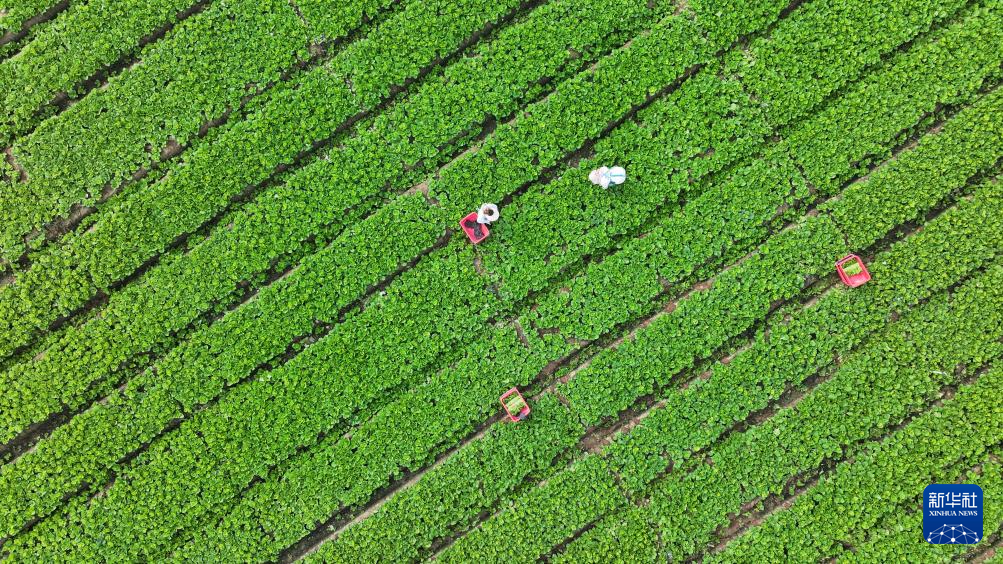 7月1日,工人在位于青铜峡市邵岗镇的益丰农业供港蔬菜基地采摘蔬菜(无人机照片)。