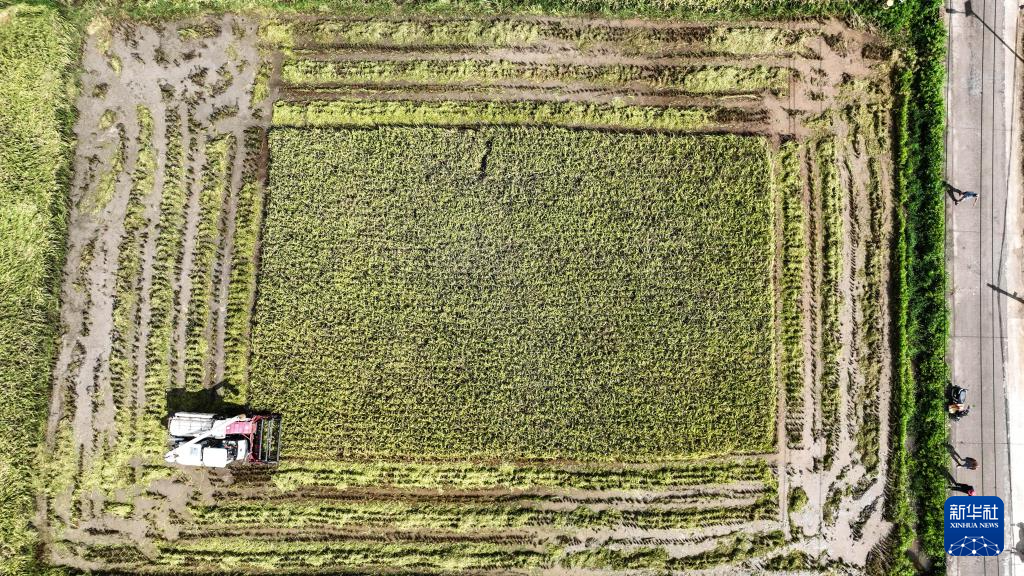 7月2日,在广西钦州市康熙岭镇板坪村,农民驾驶收割机收获稻谷(无人机照片)。