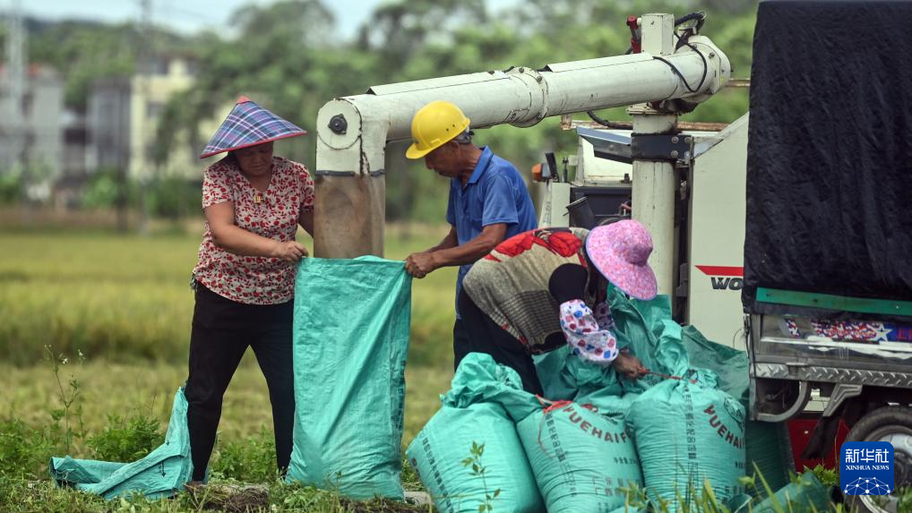 7月2日,广西钦州市康熙岭镇板坪村的村民将收割机收获的稻谷装袋。