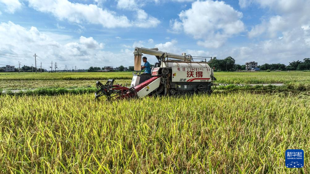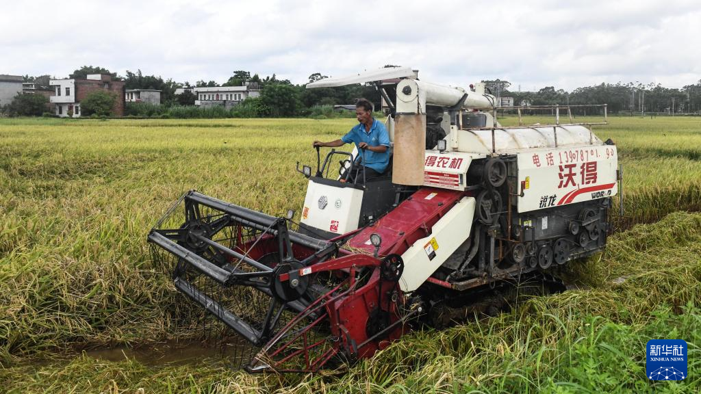 7月2日,在广西钦州市康熙岭镇板坪村,农民驾驶收割机收获稻谷。