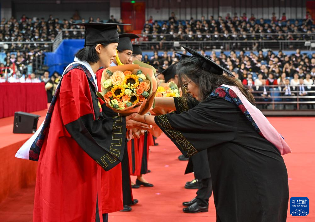 7月2日,毕业生在毕业典礼上为教师代表献花。