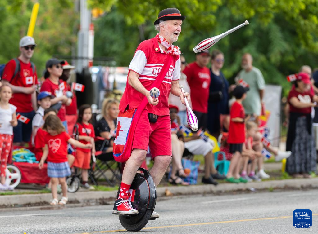 7月1日,一名男子在加拿大多伦多国庆日游行中表演杂技。