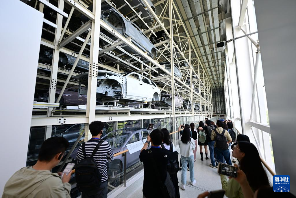 7月1日,在合肥市新桥智能电动汽车产业园蔚来第二工厂,媒体记者参观“魔方”车辆存取平台。