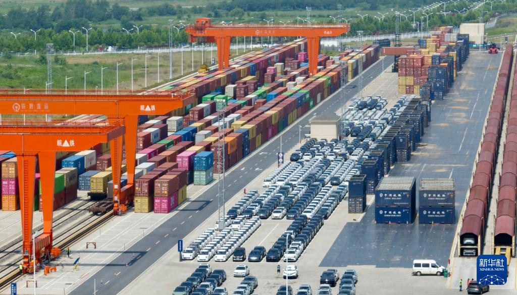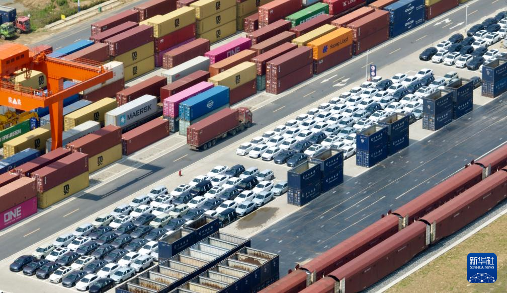 6月17日,在合肥派河港铁路物流基地等待装车出口的新能源汽车(无人机照片)。