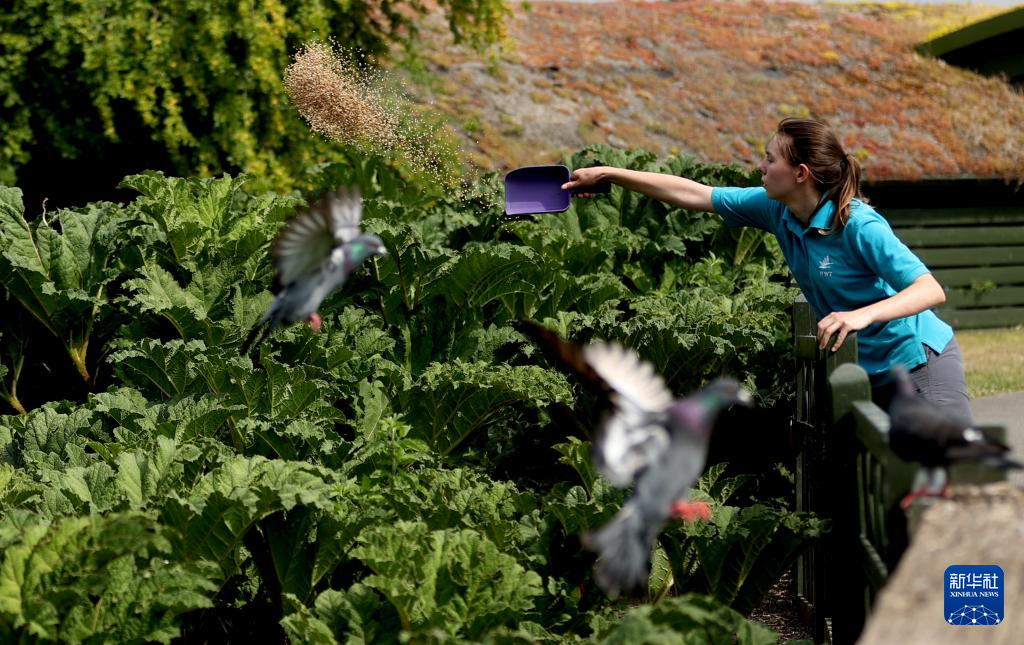 在英国伦敦湿地中心,工作人员给栖息的鸟儿喂食(6月20日摄)。