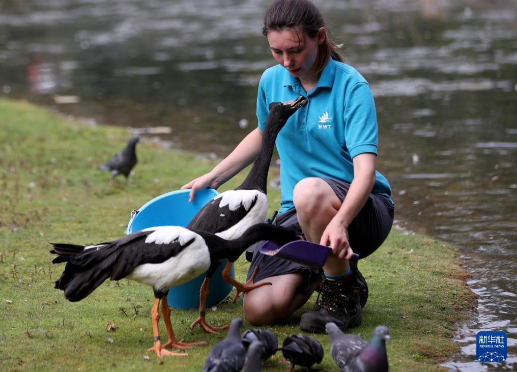 在英国伦敦湿地中心,工作人员给鹊雁喂食(6月20日摄)。