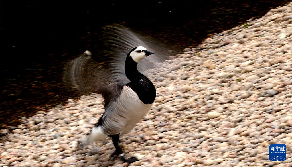 在英国伦敦湿地中心,一只白颊黑雁抖落羽毛上的水珠(6月20日摄)。
