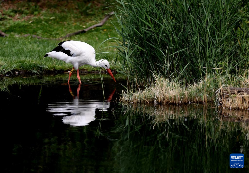 一只白鹳在英国伦敦湿地中心的水边觅食(6月20日摄)。