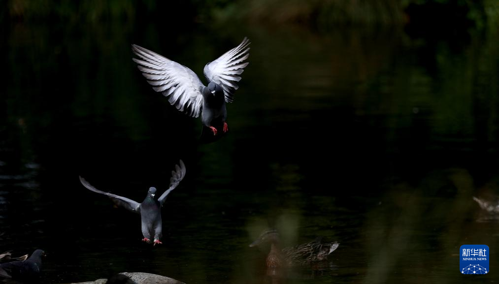 两只野鸽在英国伦敦湿地中心飞翔(6月20日摄)。