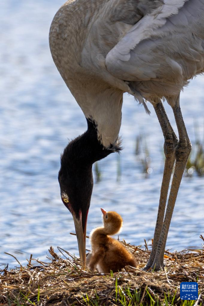 在西藏那曲市申扎县,一只黑颈鹤查看刚出壳雏鸟的情况(6月4日摄)。