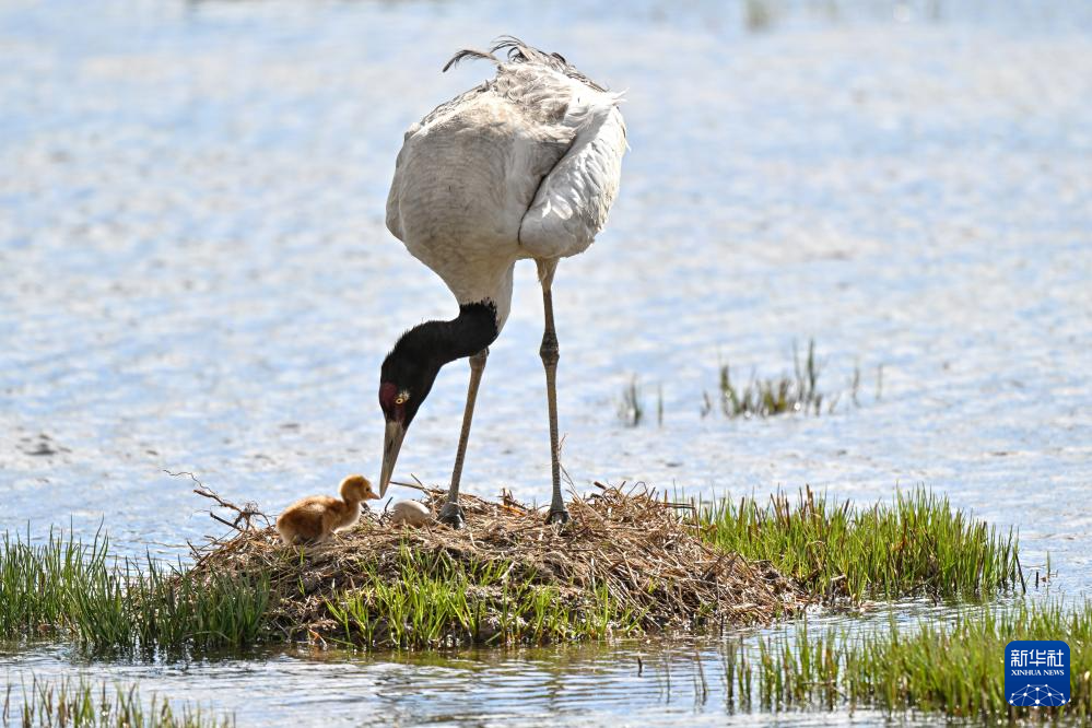 一对黑颈鹤在西藏那曲市申扎县的湿地上照顾刚出壳的雏鸟,一只将其护在身下保持温暖,另一只则在旁保持警戒(6月4日摄)。