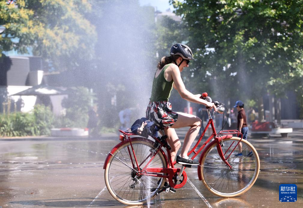 7月3日,在奥地利维也纳,一名女子骑车经过一处喷泉装置。