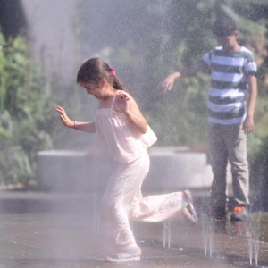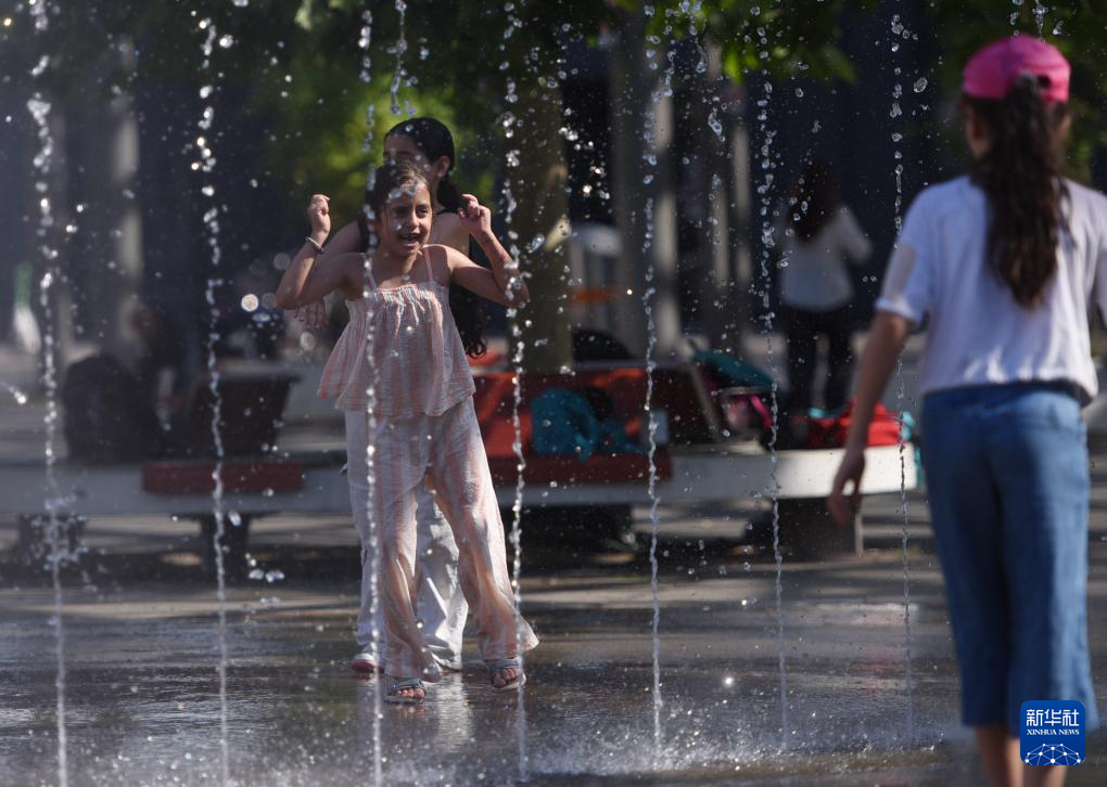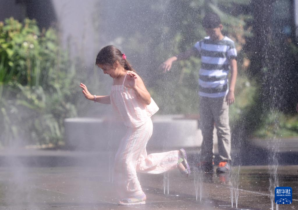7月3日,在奥地利维也纳,孩子们在一处喷泉装置旁玩耍。