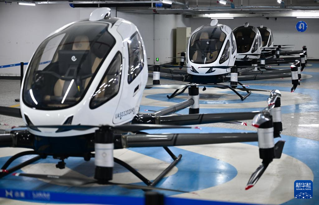 7月2日,在合肥骆岗公园,几架电动垂直起降飞行器(eVTOL)停放在充电机库中。