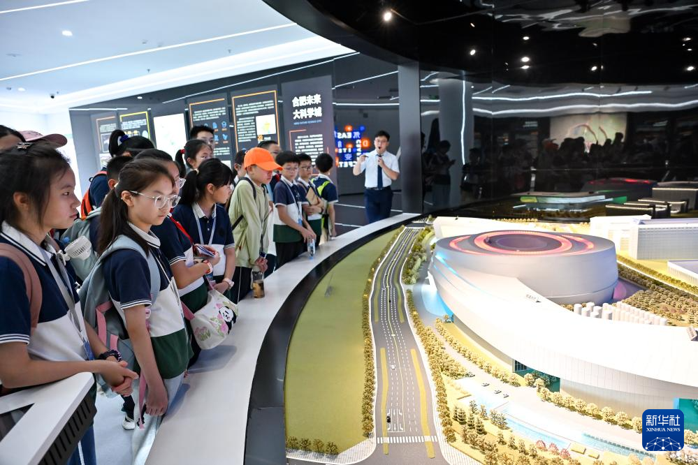 7月1日,学生们在聚变创新展览馆内的紧凑型聚变能实验装置(BEST)模型前参观学习。