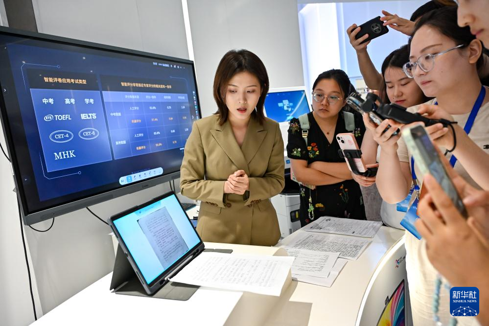 7月2日,一名工作人员在科大讯飞人工智能体验馆介绍AI学习机的批改作业功能。