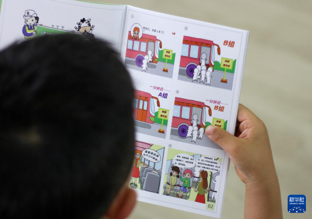 7月3日,在乌鲁木齐一所幼儿园,小朋友在阅读交通安全绘本。