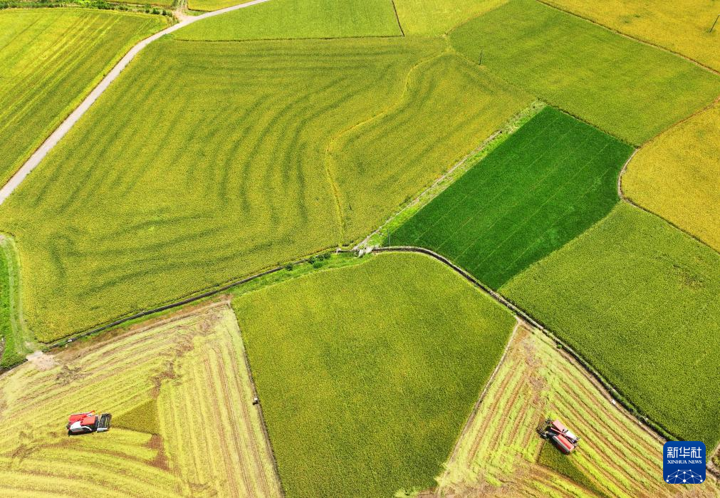 7月3日,在湖南省衡阳市衡山县白果镇,村民驾驶收割机收割早稻(无人机照片)。